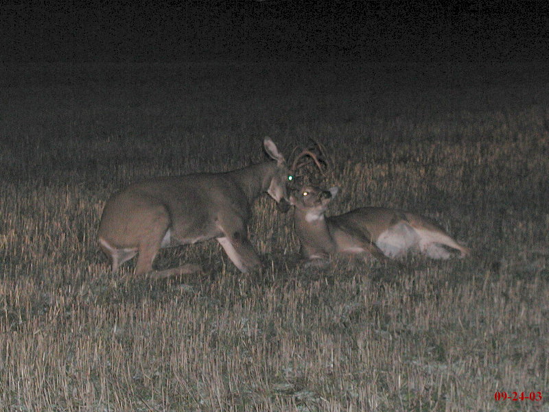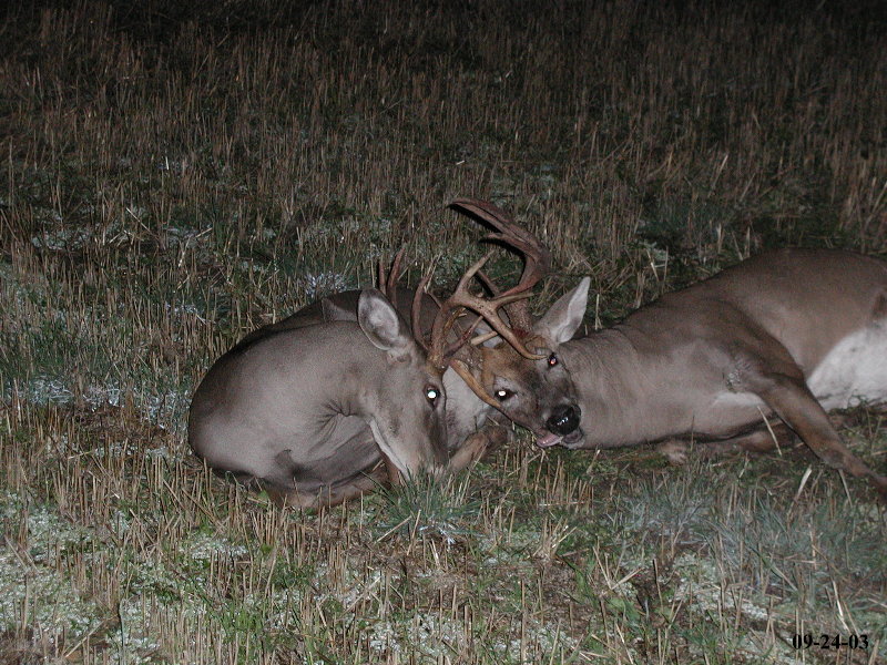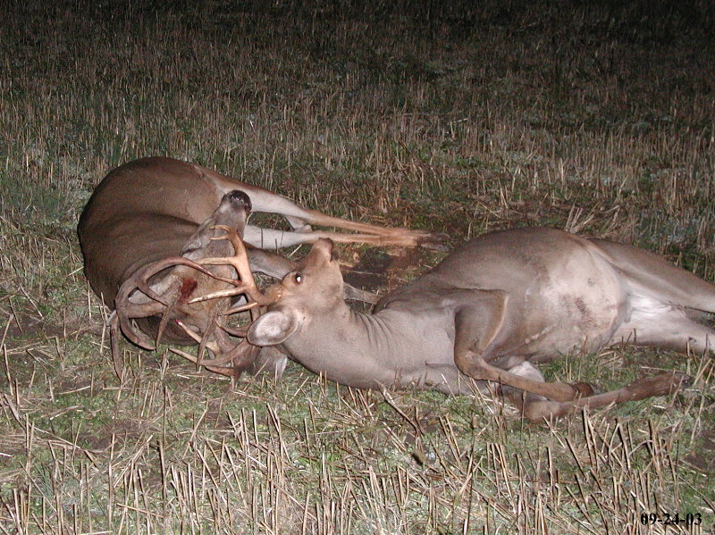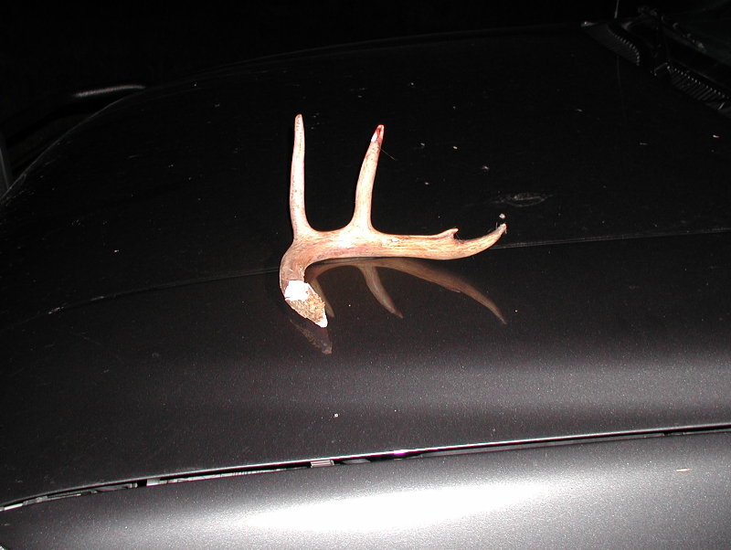 > > * Hi. I found these two bucks locked up around midnight last night. At first I thought the smaller one was dead as it was down and other one was standing. At times the bigger one would toss the smaller one around like a rag doll. Amazing strength. I found the smaller one was very much alive and at times would get up and try to toss the big one around. Obviously if we didn't do something they both were going to die. When both were on the ground I had a good look at the smaller bucks antler that was locked with the big one. (only one rack of each were locked) I had an opportunity to try to shoot the rack and not hit either buck and my .45 hit home. The antler picture is of the one I shot off and it's laying on the warden's hood. After the shot, both bucks bolted in opposite directions. I couldn't believe they were able to run like that as exhausted as they were. What a cool night.